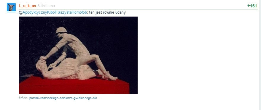 — Этот момент тоже удачный, — пишет L_u_k_as, разместивший фото «памятника», на котором советский солдат насилует беременную польку. (Этот «произведение» автор пытался в 2013 году установить возле памятника танку Т-34 в Гданьске.)