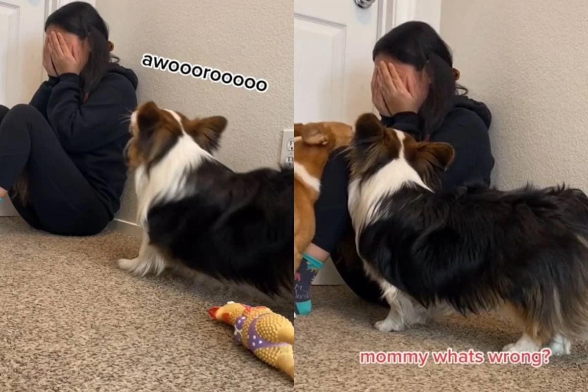 Хозяйка двух очаровательных песелей Оли и Батлера решила проверить, как питомцы отреагируют, если она при них неожиданно заплачет. Девушка села у стены, закрыла лицо руками и начала издавать жалобные звуки. Пары секунд хватило, чтобы обеспокоенные собакены подскочили к своей хозяйке и начали ее утешать.