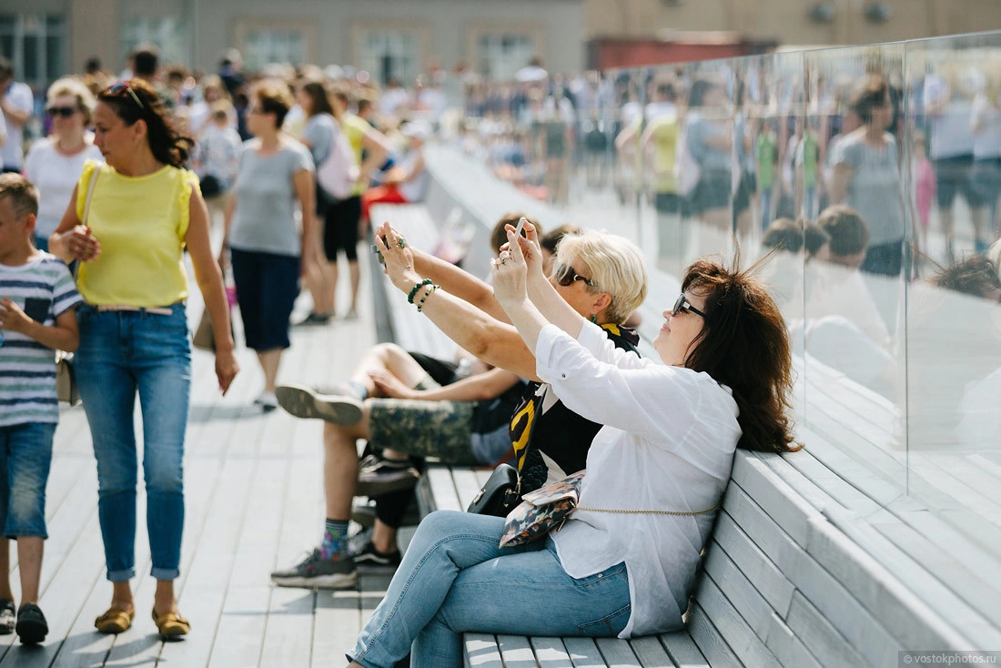 17. Раньше перед входом на мост стояли заборы и полицейские, которые организовывали одностороннее движение. И это была большая ложка дегтя. Сейчас на мосту всего этого нет. Теперь, правда, на время проведения Урбанфорума появился забор вокруг концертного зала и восточной части парка)