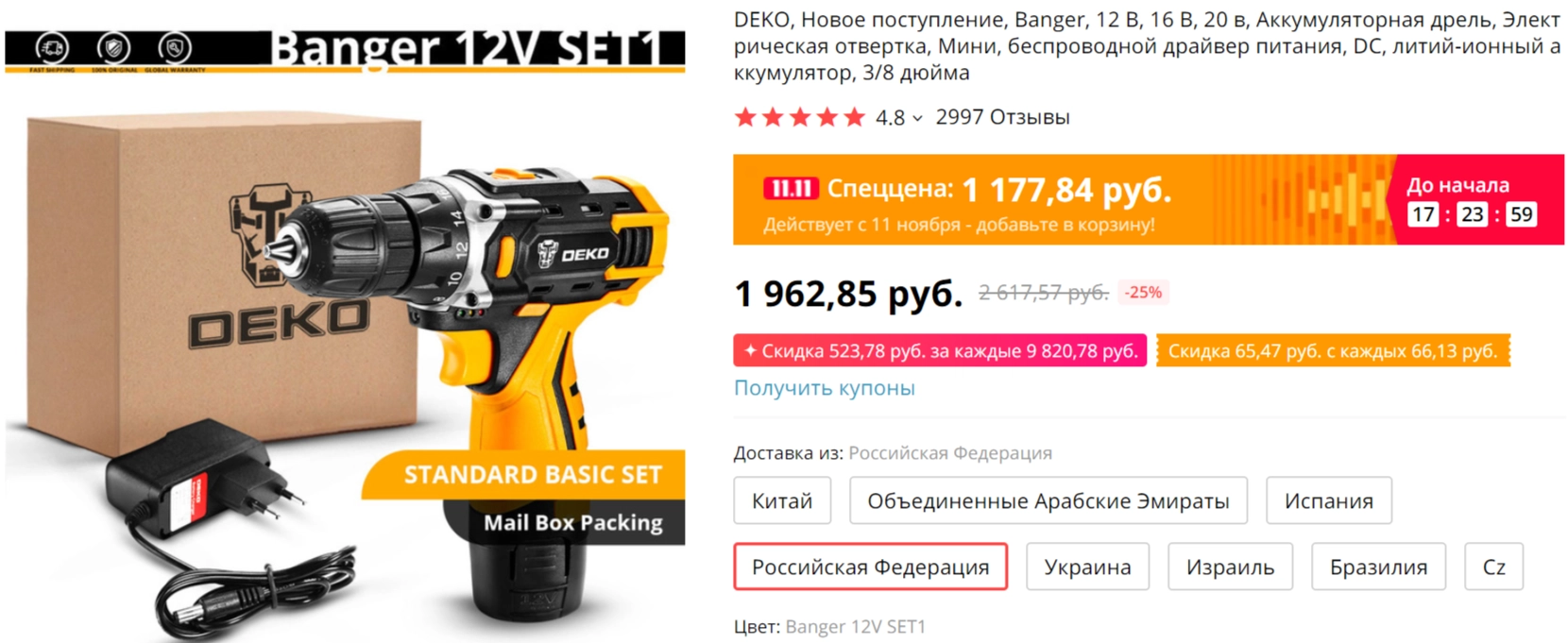 Бред Deko уже стал волне заслеженным китайским производителем аккумуляторного инструмента, просто почийте отзывы и убедитесь сами. При этом ценовая политика производителя остается очень лояльной. Вполне современная аккумуляторная дрель с li-ion аккумулятором, редуктором, и даже светодиодной подсветкой рабочей зоны менее в день распродажи будет стоить менее 1200 рублей. И кстати доставка из России у этого продавца дешевле, че из Китая, обратите на это внимание при заказе.
