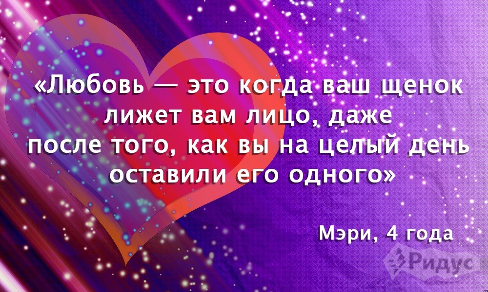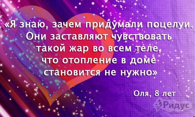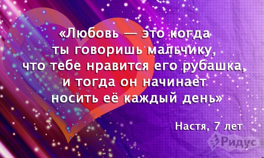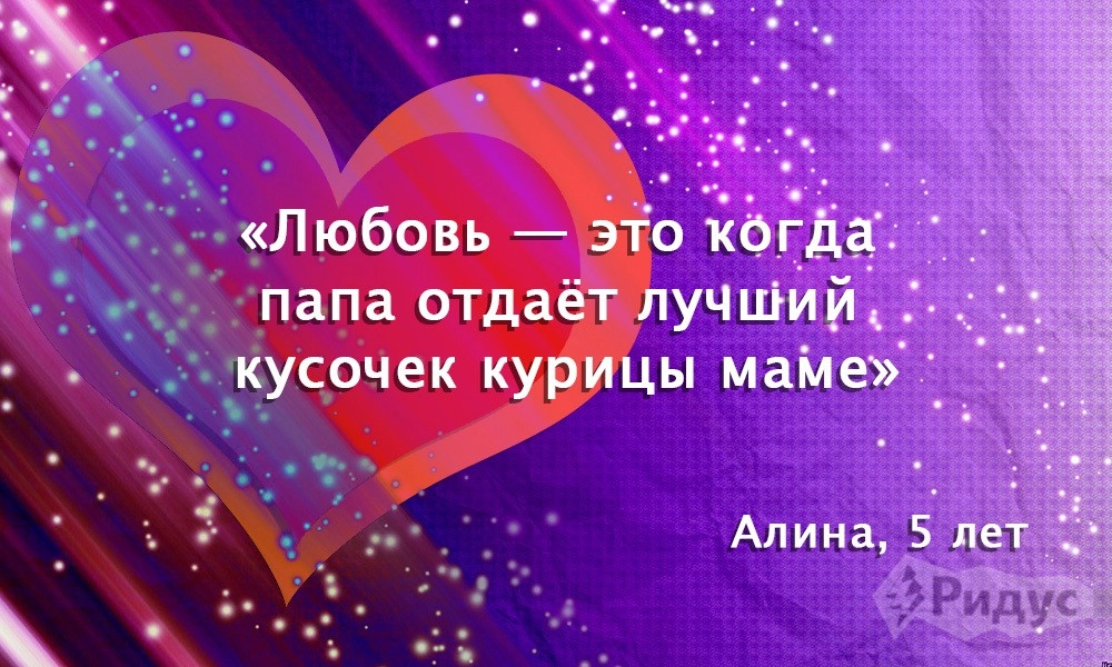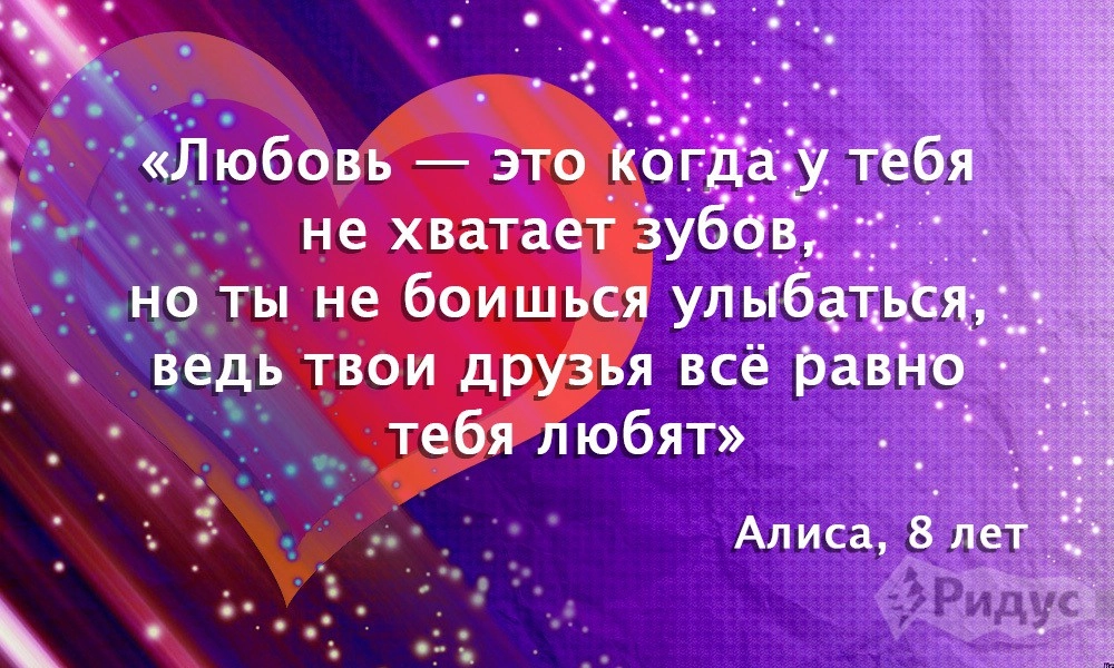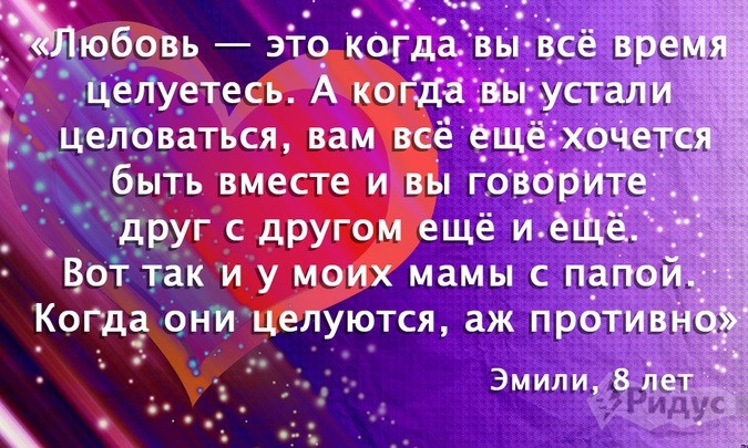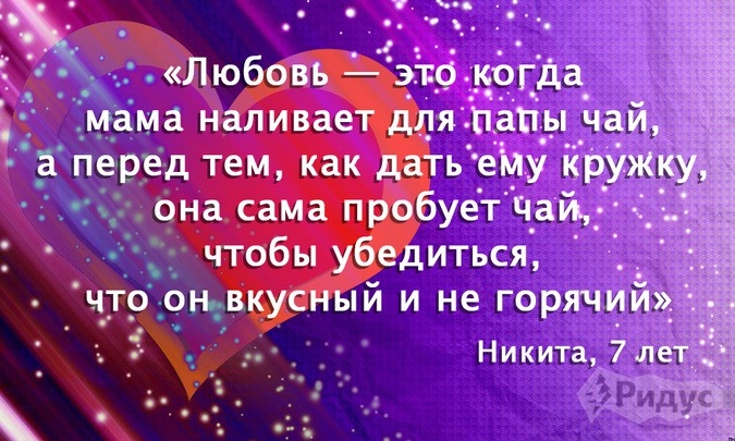 Маленькие дети ещё не умеют врать ради того, чтобы произвести хорошее впечатление. На любой вопрос они отвечают именно то, что думают. Поэтому на вечные вопросы, вроде «зачем мы живём», «что такое добро», «как стать счастливым», отвечают всегда очень честно и нестандартно. На этот раз мы решили спросить у детей «Что такое любовь?» и получили очень смешные и жизненные определения этого прекрасного чувства. Кстати, их можно использовать в качестве готовых валентинок. Улыбнитесь вместе с нами, а потом скажите близким, что вы их любите!