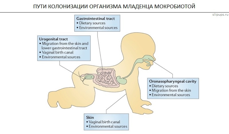Рождение естественным путем и грудное вскармливание формирует видовой костяк микробиоты, который обычно сохраняется на всю жизнь. Дальнейшее обогащение микробиоты другими видами бактерий зависит от образа жизни.