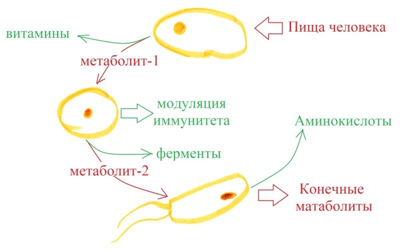 А теперь представьте, как десятки и сотни видов микроорганизмов объединены в более длинные и разветвленные метаболические цепи, продуцирующие незаменимые аминокислоты, витамины и прочие метаболиты, тем самым модулируя пищеварение, иммунитет и даже наше поведение, в том числе пищевое.