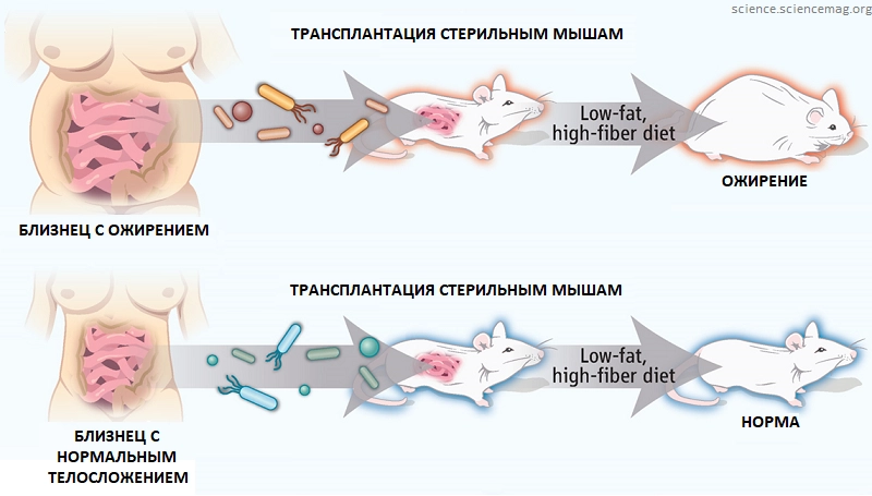 Предполагаемая «микробиота ожирения» нашла подтверждение в экспериментахпо трансплантации фекалий от людей с разным телосложением к стерильным мышам. Чтобы исключить прочие факторы микробиоту для трансплантации набирали у 8 близнецов, пары которых различались по наличию и отсутствию ожирения, а мыши, получившие микробиоту от людей с разным телосложением, проживали раздельно.