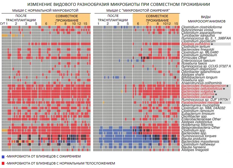 Анализ микробиомов демонстрировал увеличение разнообразия микробиоты у мышей, изначально получивших однообразную «микробиоту ожирения». Важно, что исходно получившие разнообразную микробиоту худые мыши не заразились ожирением от сожителей.