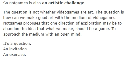 Так вот, создатели неигр акцентируются на художественной части видеоигры и выходят за рамки таких понятий как «победа» или «поражение» — главным элементом notgames-видеоигр является получение уникального опыта, а не достижение какой либо цели.
