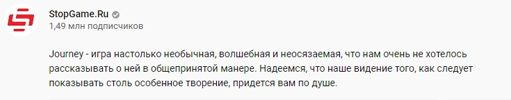 Например, обзор того же FireWatch на StopGame не показал и десятой части того о чём эта игра, но зато заспойлерил всё что возможно за первые же 2 минуты. Однако по иронии судьбы, на том же канале StopGame был единственный уместный notgame-обзор, который я видела — в нём просто показывают кадры из игры Journey, а фоном женский голос читает стихотворение, комментарии к видео отключены.