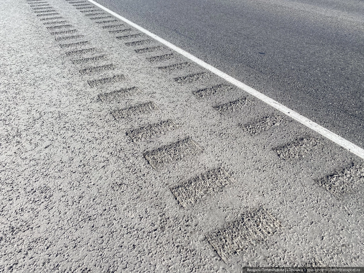 Шумовые полосы бывают разных видов. В данном случае они выполнена снятием верхнего слоя асфальта через равные промежутки. Иногда её выполняют толстой прерывистой разметкой с очень короткими полосами. Раньше такой вариант применялся в Беларуси на трассе М1, есть ли это сейчас — не знаю. Вариант со снятием покрытия мне кажется более надёжным и долговечным.