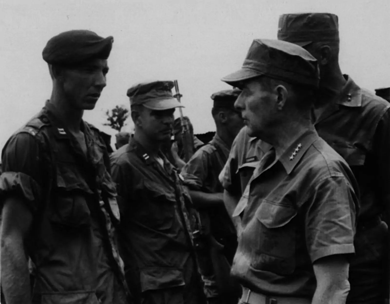 Герой Ланг-Вэя капитан Фрэнк Уиллоуби (в берете) на базе в Кхе-Сане разговаривает с командующим морской пехотой США генералом Уоллесом Грином, 9 августа 1967 года. До битвы за Кхе-Сан и Ланг-Вэй оставалось около полугода