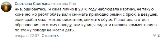Заместитель начальника управления образования района Айзиряк Рамазанова пояснила телекомпании НТР, что, возможно, металлоискатель среагировал на косточки, вшитые в бюстгальтер. Металлорамка часто реагирует на бляшки ремней, серьги, ключи и другие предметы.