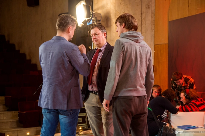 Рассредоточились по залу и мирно спят усталые операторы, камеры спят… Гитара Пушного ревет проигрыш. «Дорогие зрители, сейчас на сцене появится Оскар, к которому так и не прикоснулся Леонардо Ди Каприо. Зато сейчас с легкостью прикоснусь я!», - объявляет Пушной - и на сцену выходит Оскар Кучера. На самом деле это помощница Таня, ведь пока идет репетиция. Кучера сейчас по-честному ничего не слышит, дожидаясь концерта в гримерке. То есть импровизаторам есть что репетировать – вводные шутки. «Наш следующий гость – Егор Дронов», - начинает Пушной. «Саш, - говорит Нетиевский, ты спроси его: «Правда, что сериал «Воронины» снимается без сценария?», - ассистентки на сцене посмеиваются. Через два часа Дронов ответит на это: «Правда. Вообще-то и без нас, само как-то катится».