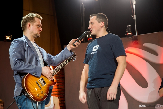 Угловая сцена в концертном зале ЦДХ. Здесь будут играть со зрителями – два часа полного интерактива и неподдельной импровизации артистов («Ридус» проверил). Оформление сцены то ли классическое, то ли бюджетное: ширмы в виде краснокирпичных стен и два дивана. Справа синтезатор, слева новая гитара Пушного. Ага, и он здесь.