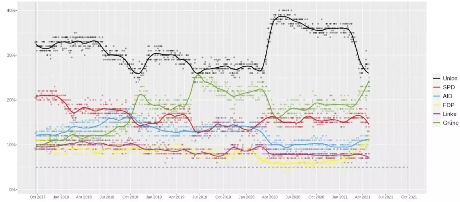 Ослабление ХДС/ХСС легко связать с коронавирусным годом, ведь у людей во многих точках мира накопились претензии к эффективности ограничений. Рейтинг ХДС/ХСС в 2019 г. во время пандемии был высоким. Его снижение — дело 2021 г., когда Лашет начал выходить на первый план, допуская ошибки.