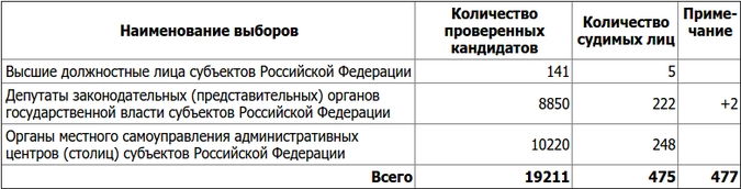 По данным ЦИК, «сведения криминального характера» получены в отношении 477 лиц. Из них пять скрытых судимостей обнаружены у кандидатов на высшие должностные лица субъектов Российской Федерации, 224 претендента на должность депутатов региональных заксобраний и 248 человек, планировавших участвовать в выборах в парламенты столиц субъектов страны также скрыли свою судимость.