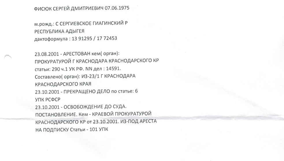 «Переговоры о передаче денег вел знакомый адвокат Фисюка, — продолжает собеседник „Ридуса“. — Однако ошалевший от такой наглости предприниматель обратился в милицию, и сделка по передаче денег проходила под контролем оперативников. Деньги должны были лечь на заднее сиденье автомобиля Фисюка, а сам от в это время должен был находиться поблизости и контролировать процесс. Почти сутки оперативники ждали, когда же после того, как деньги попали в автомобиль, Фисюк возьмет их в руки. Дождались».