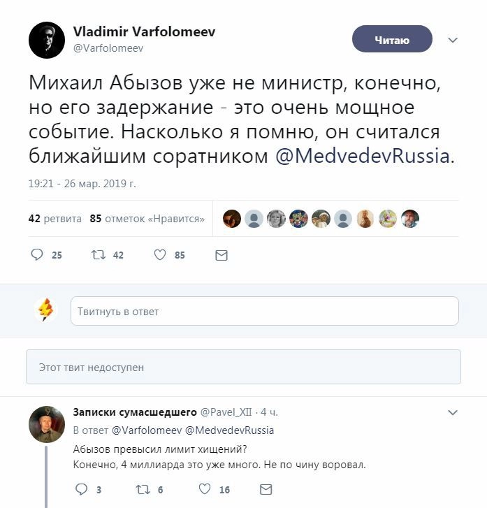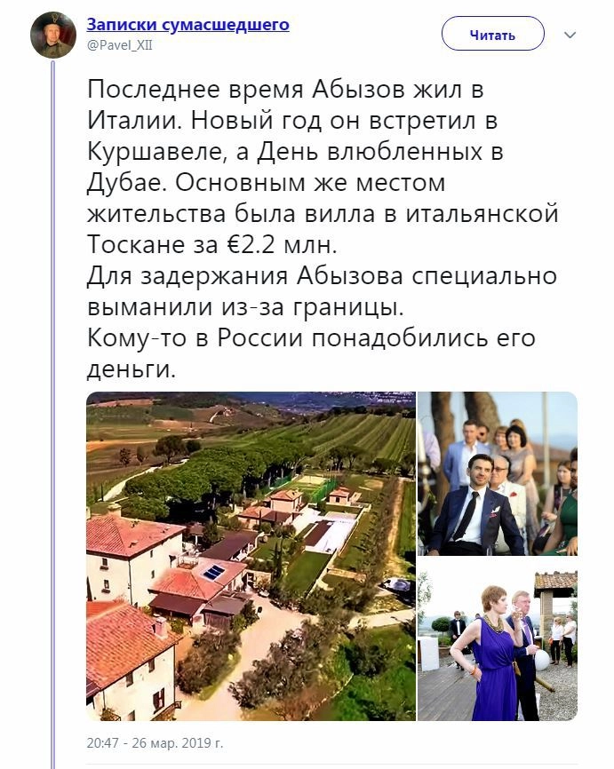 Интерес вызвали обстоятельства его задержания: после отставки из правительства Абызов проживал в Италии на своей вилле в Тоскане, а в России оказался якобы по приглашению некоего высокопоставленного «друга» под «гарантии безопасности». Не обошлось и без шуток в адрес экс-министра, иногда довольно желчных.