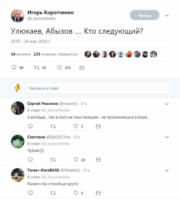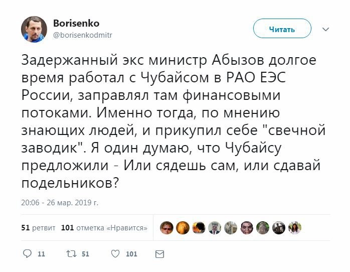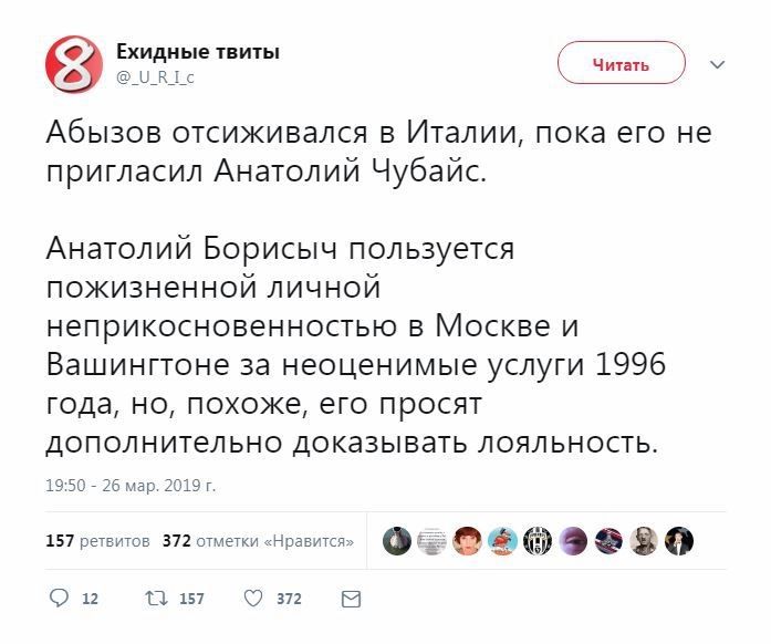 «Чубайс — на сладкое. Абызову можно впарить не 20, а всего лишь 10 лет тюрьмы, он станет свидетелем против Чубайса. А суд над Чубайсом и над 90-ми, и над приватизацией, и над капитализмом с ежедневными часовыми отчетами из зала суда перед программой „Время“, скажите мне — это же позабористее Крыма можно сделать, а? Люди — новая нефть, Чубайс — новый Крым», — написал в своем паблике главред радиостанции «Говорит Москва» Сергей Доренко