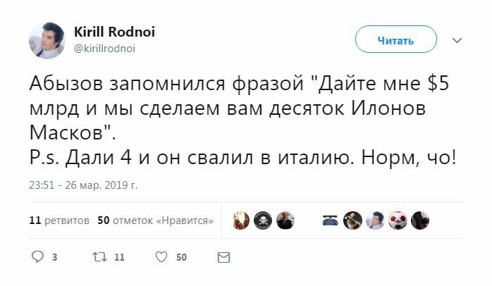 Особо блогеры отметили, что в 2015 году Абызов оказался самым богатым членом кабмина с официальным доходом более 455 миллионов рублей, а также фигурантом списка двухсот богатейших россиян по версии журнала Forbes.