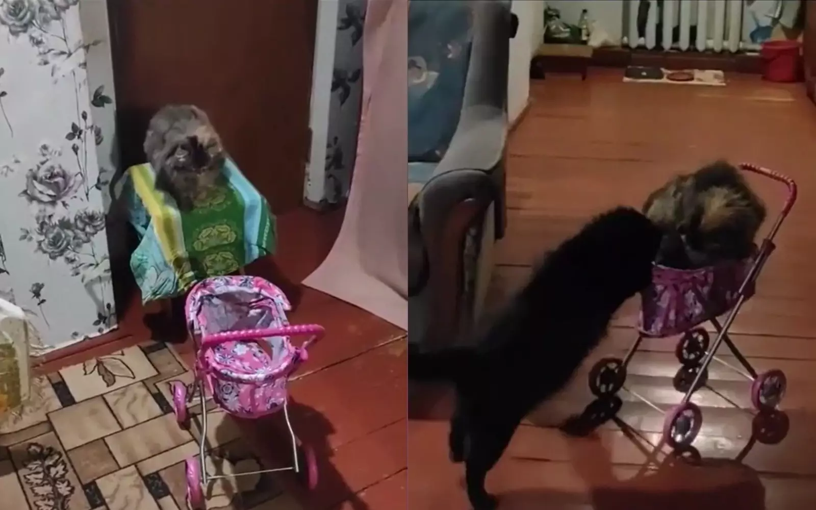 Пушина села в розовую «карету», а Чернуха, встав на задние лапки, покатил ее в сторону тарелочек с кормом. После чего довольные котейки получили вкусную награду за свои труды. Интересно, кто кого повез на коляске после обеда?