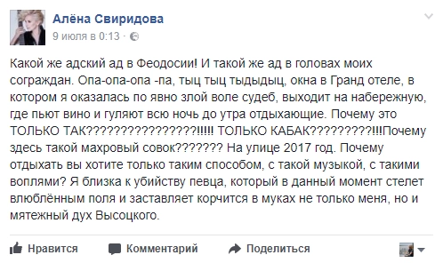 «Какой же адский ад в Феодосии! ... Окна в „Гранд отеле“, в котором я оказалась по явно злой воле судеб, выходит на набережную, где пьют вино и гуляют всю ночь до утра отдыхающие. Почему это только так?! Только кабак?! Почему здесь такой махровый совок? На улице 2017 год», — возмутилась артистка в Facebook.