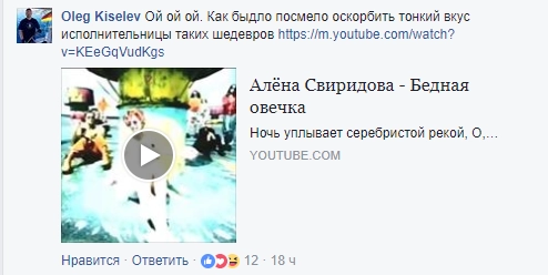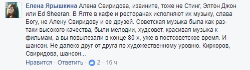 Многих слова Свиридовой серьезно обидели. «Вот не надо трындеть. Вторую неделю ездим по Крыму, быдла не видели», — не согласились со звездой блогеры и напомнили, что и сама Алена — не Стинг. Поэтому жаловаться на музыку, звучащую на набережных, не стоит.