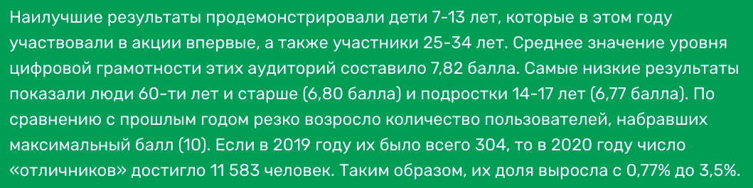 Подведены итоги второй образовательной акции «Цифровой диктант 2020», которая проходила с 28 марта по 11 апреля текущего года и стала самой масштабной инициативой по проверке цифровой грамотности россиян. По данным организаторов проекта, в акции приняли участие 330 148 человек — это более чем в восемь раз превысило количество участников предыдущего диктанта.