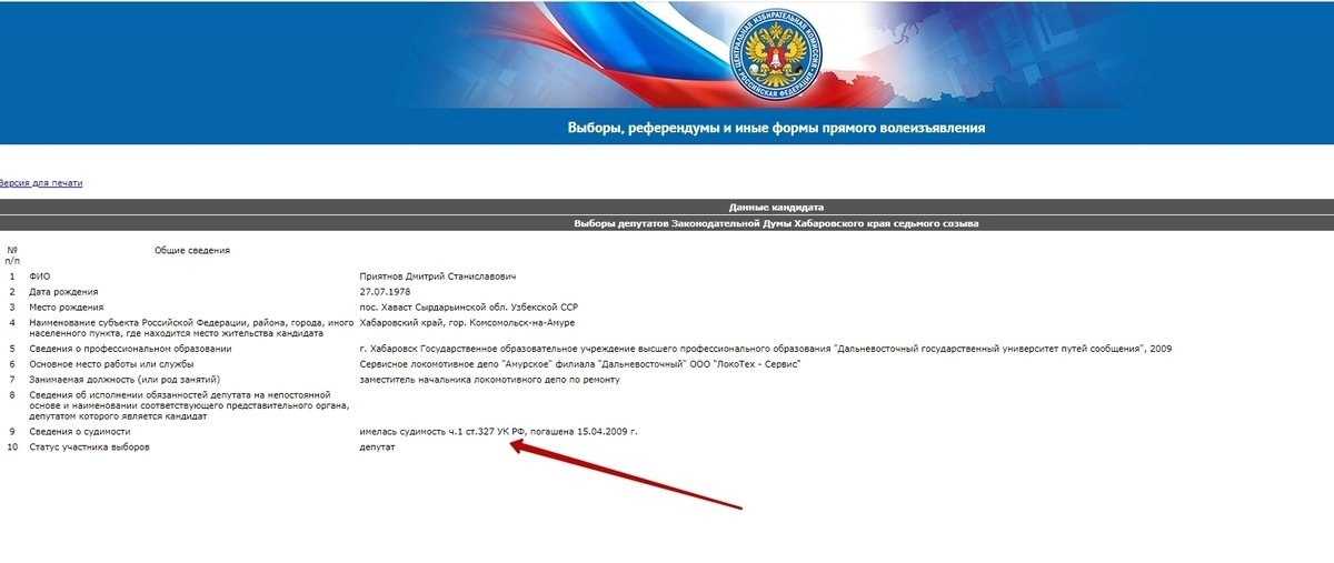У избранного сенатором от заксобрания Хабаровского края либерал-демократа Дмитрия Приятнова обнаружилась погашенная судимость, информацию о которой по какой-то причине не была указана на сайте местного избиркома.