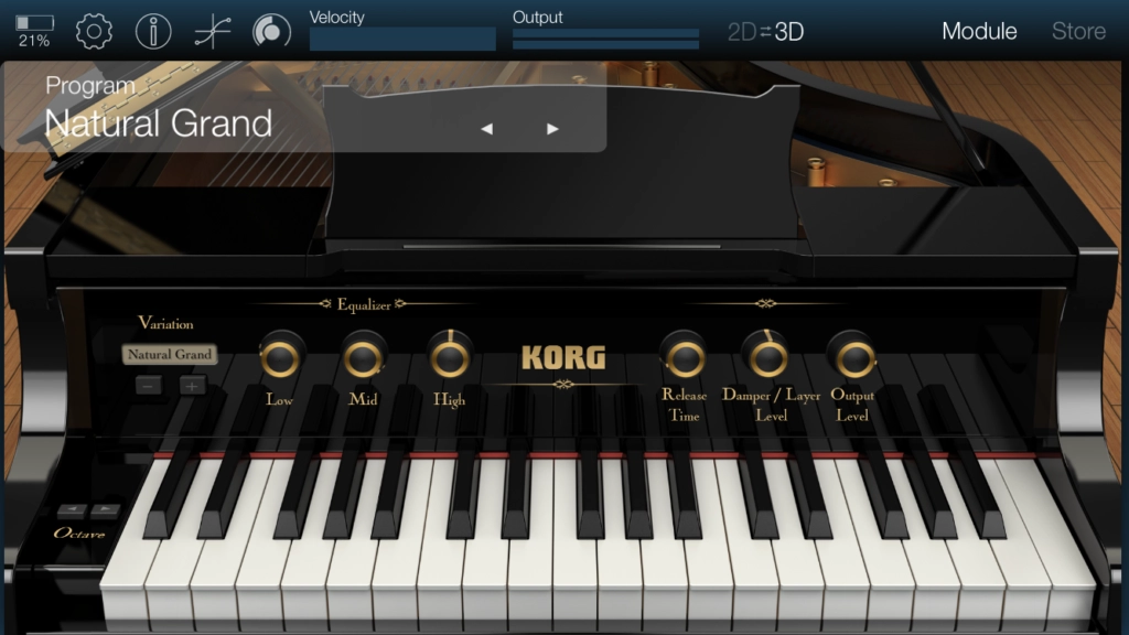 Простая, но весьма элегантная имитация фортепиано от Korg. На борту имеется простой фильтр и возможность регулировать силу нажатия клавиш.
