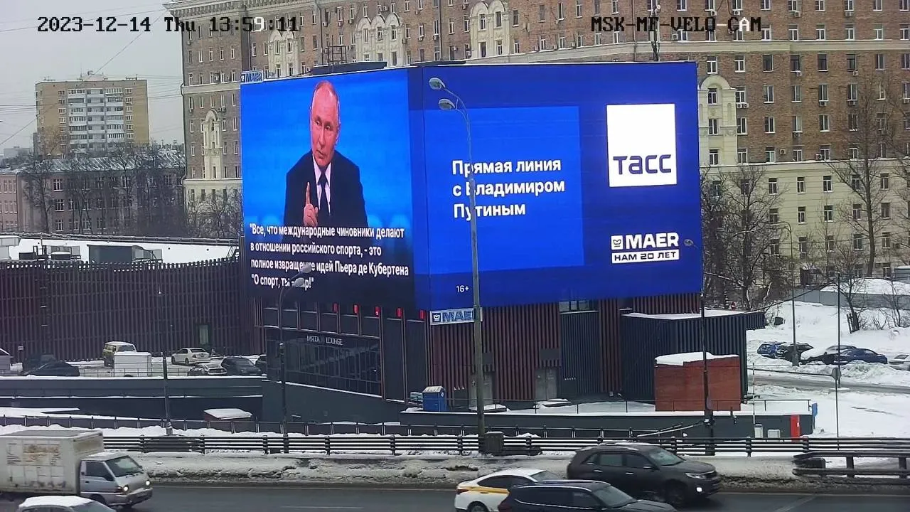 Информационное агентство ТАСС и медиахолдинг MAER установили в Москве огромные экраны с высказываниями президента Владимира Путина по итогам 2023 года.