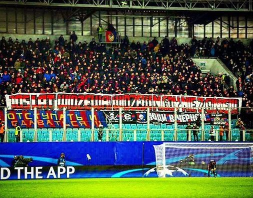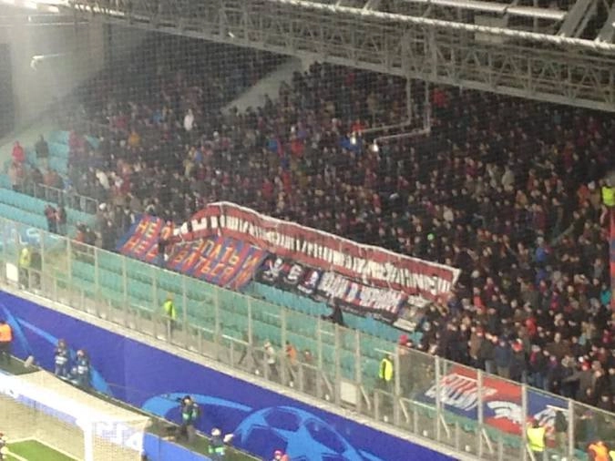 Еще на трибуне болельщиков красно-синих появился траурный баннер о погибших вчера в Сирии двух российских солдатах, а также поздравление своих польских друзей из Лодзя со 105-летием их клуба «Видзева».
