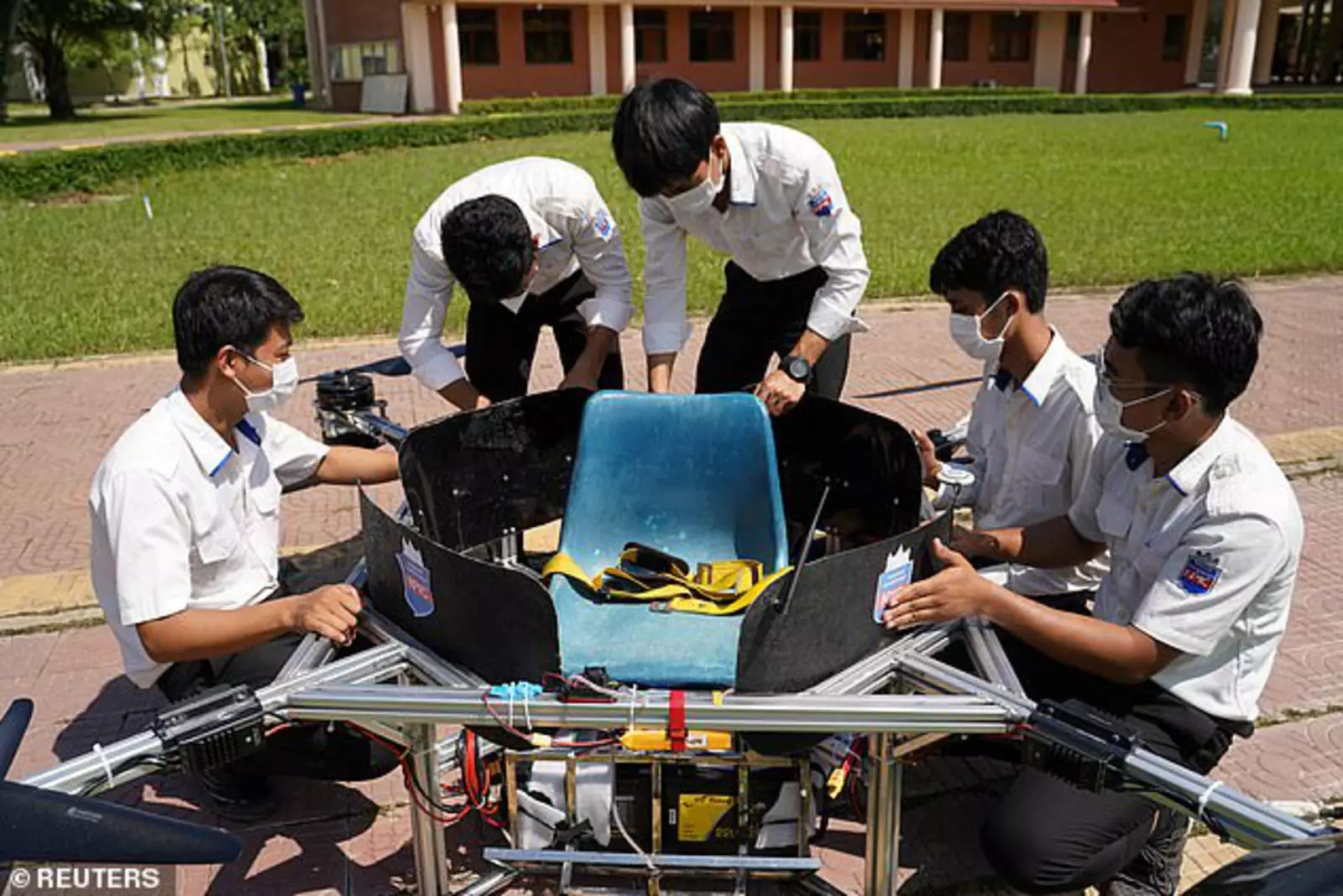 Молодые люди из Национального политехнического института Камбоджи превратили школьный стул в летающее средство передвижения, оборудовав его восемью пропеллерами, которые позволяют устройству подниматься на высоту четырех метров.