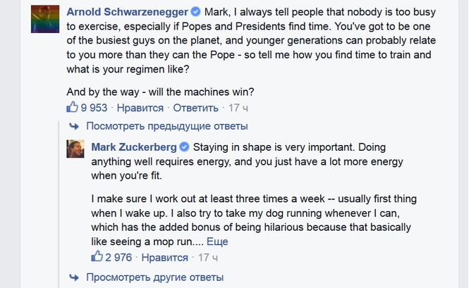 Шварценеггер в комментарии заметил, что никто не может столь занят, чтобы не заниматься спортом, если даже и президенты и Папа Римский находят время на физические упражнения. «Ты, пожалуй, один из самых занятых людей в мире, и молодое поколение скорее последует твоему примеру, чем примеру Папы Римского», — написал актер Цукербергу.