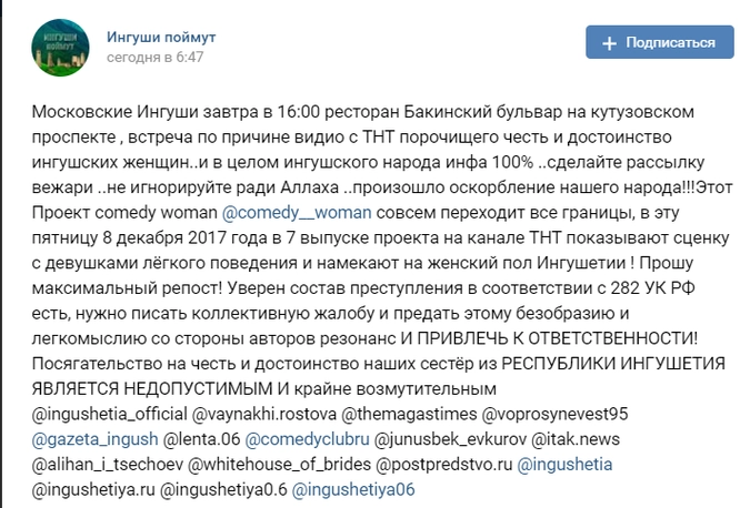 «Да унизит их Аллах»: обиженные ингуши угрожают авторам Comedy Woman