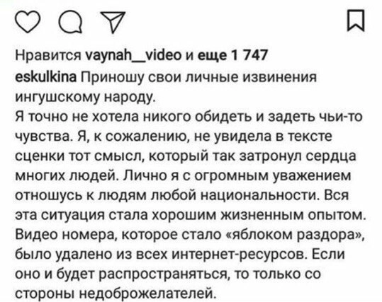 Актриса Екатерина Скулкина также извинилась у себя в Instagram. «Я точно не хотела никого обидеть и задеть чьи-то чувства. Я, к сожалению, не увидела в тексте сценки тот смысл, который так затронул сердца многих людей», — подчеркнула она.