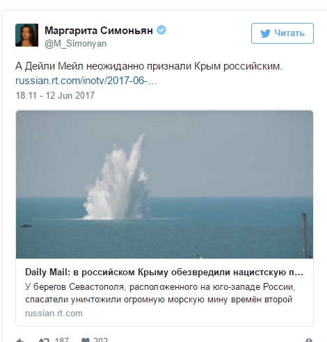 На публикацию тут же отреагировала главред российского телеканала Russia Today Маргарита Симоньян.