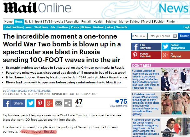 Британское издание Daily Mail сообщило о подрыве морской мины времен Второй мировой войны в Крыму. При этом газета назвала полуостров российским.