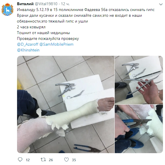 Пациент одной из поликлиник Самары пожаловался, что врачи выдали ему кусачки, чтобы он снимал гипс самостоятельно.