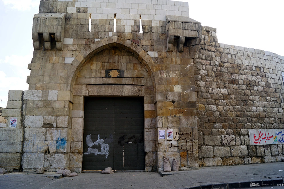 Ворота Фомы,стоящие на площади - одни из семи сохранившихся до наших дней ворот Старого города (всего их было 9). Говорят, чтоеще в начале 20 века стена города была цела и город на ночь запирали. Чтоб всякие темные личности по его закоулкам ночами не шастали. Позднее часть стен была разрушена. Но ворота постарались сохранить. У древних ворот (изначально, они были заложены еще в античный период, если не раньше) огромные, обитые железом, крепящимся на кованных гвоздях, двери. Сегодня их посекло осколками. В асфальте зияет отметина от снаряда. Вокруг дыры спокойно ходят люди: ловят тут же такси, проходят мимо, куда-то спеша. Видимо, ничего не знают о сегодняшнем происшествии. Следы крови в Сирии стараются замывать после терактов моментально, а отметина на асфальте может быть старой.