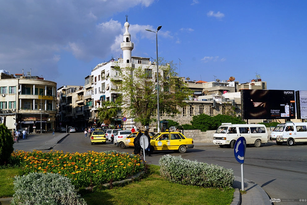 В районе одной из оживленной площади Ворот Фомы (по-арабски Баб Тума) упало 4 минометных снаряда.Один из них плюхнулся прямо перед средневековыми городскими воротами, осколками посекло древнюю обитую железом "дверь" и пробило дыру в асфальте. Пострадали стоявшие рядом автомобили, принадлежащие гуманитарной организации. Часть площади огорожена - пытаются оградить от терактов находящееся на площади отделение полиции. Просачиваюсь за ограждение, показывая аккредитацию на работу в качестве журналиста в Сирии. Пара минут на формальности в полицейском участке (субординацию лучше соблюсти - не придется объяснять каждому встречному, что это я тут около полиции и блок-поста снимаю) и ко мне временно "приписывают" офицера полиции.Поднимаемся на крышу. Два года тому назад с этой же крыши я снимала митинг в поддержку правительства. Делаю несколько кадров, прошу объяснить, куда тут что упало.Внизу спокойно ходят люди. Также, как и в час дня, когда район площади был подвергнут обстрелу. Делаю несколько кадров, спускаемся вниз.