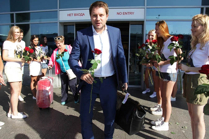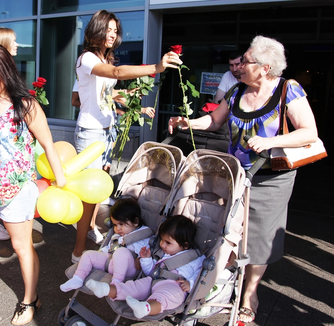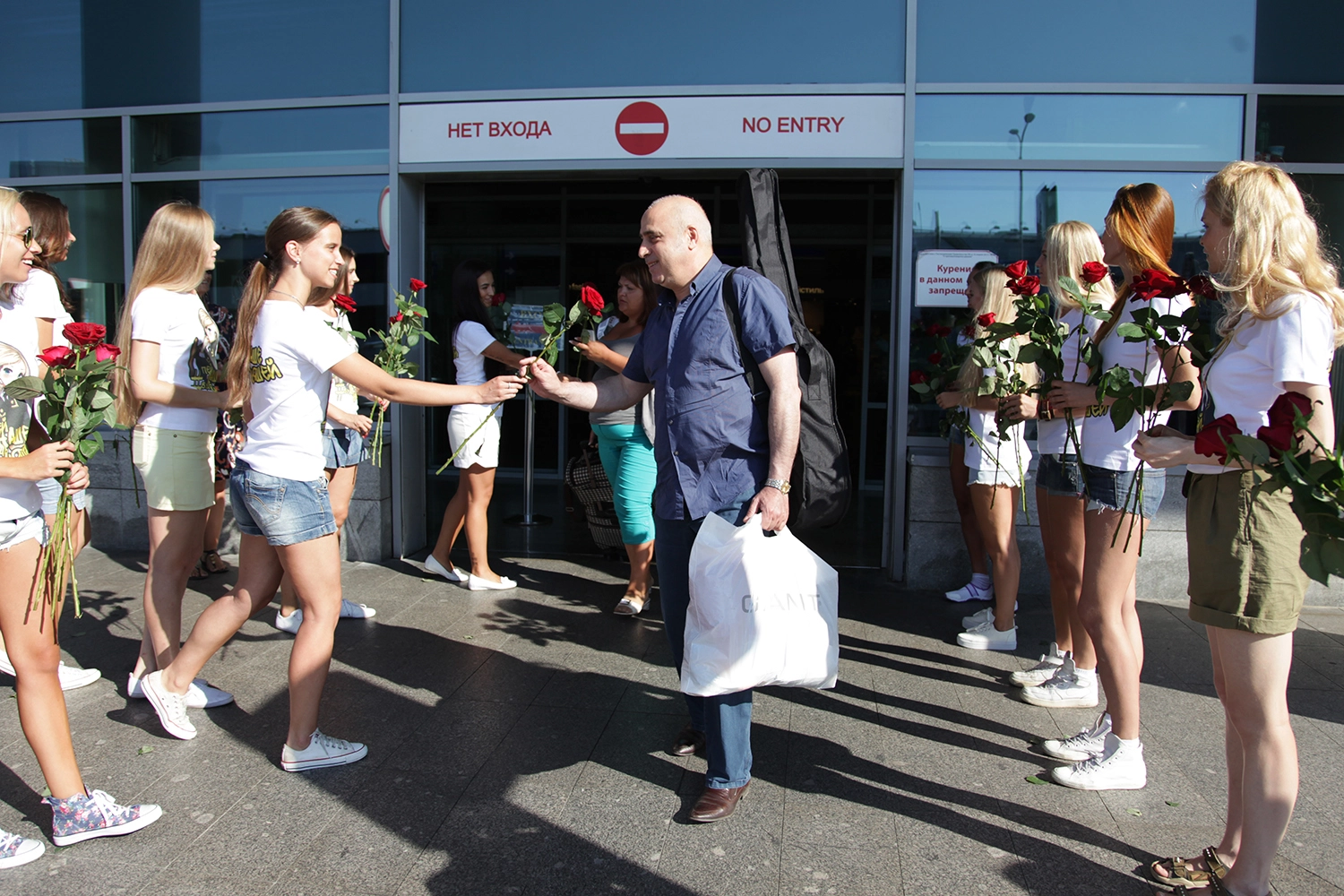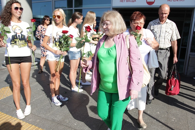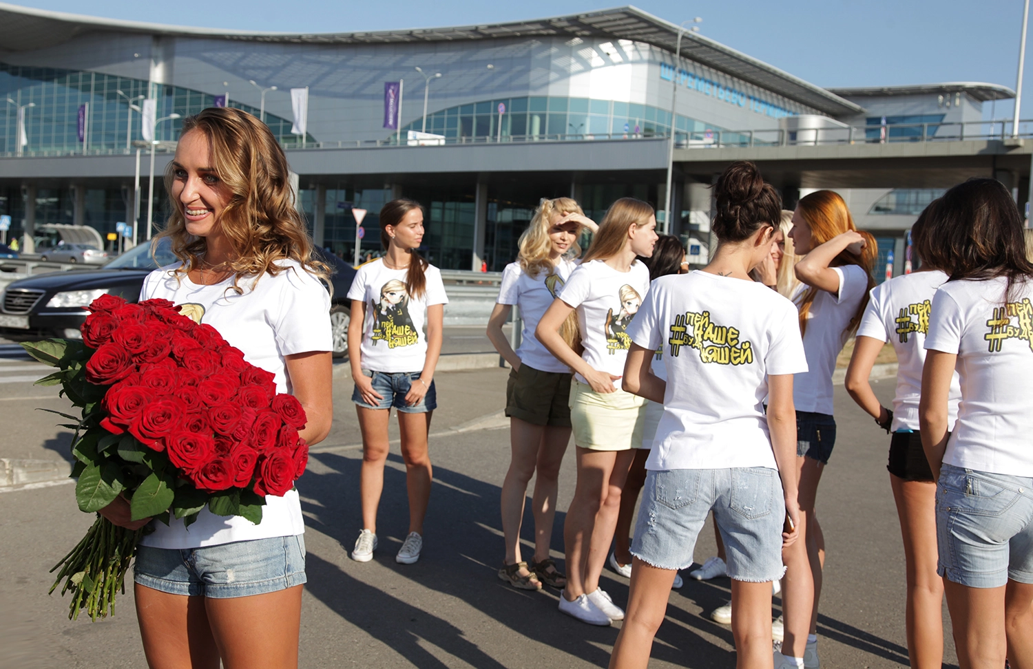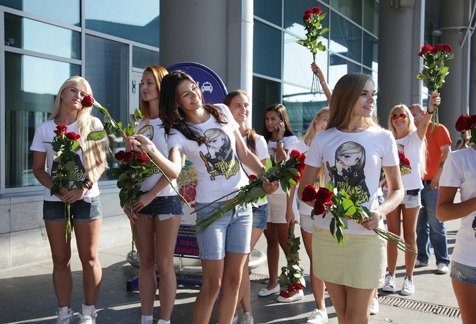 Дамы с портретами прокурора Крыма приветствовали пассажиров Шереметьево