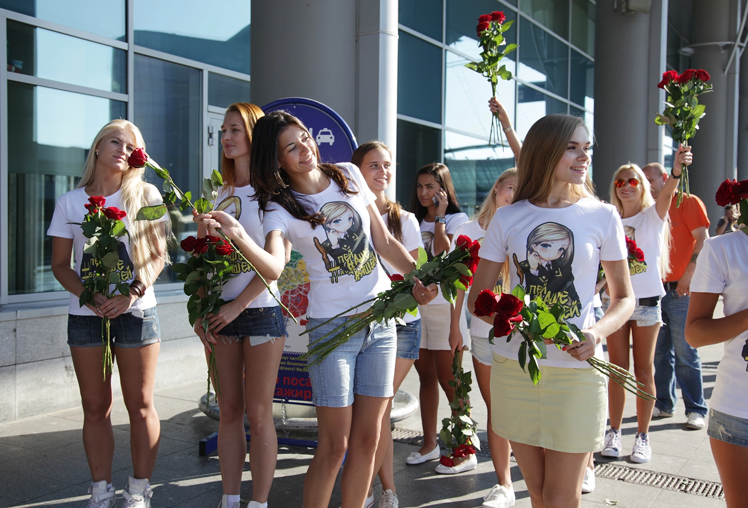 Прибывшие в Москву крымчане и москвичи, вернувшиеся с отдыха, были встречены у выхода толпой красивых девушек с цветами в руках и в футболках с анимированным изображением прокурора Крыма Натальи Поклонской, подписанным словами «Пей наше - будь няшей».