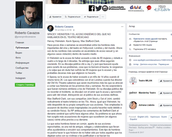 В частности, об этом рассказал мексиканский актер Роберто Кавасос. Он написал на своей странице в Facebook, что Спейси домогался его в баре лондонского театра, художественным руководителем которого был с 2004 по 2015 год. По словам мексиканца, для Спейси это было совершенно естественно.