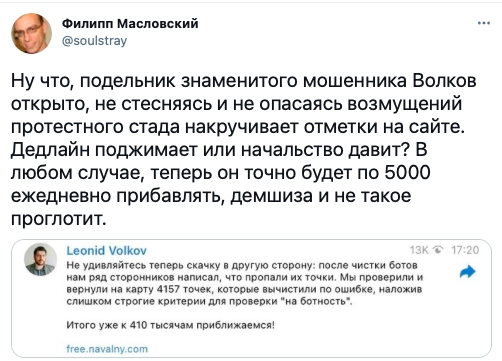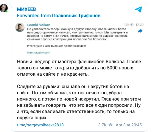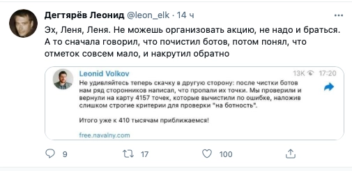 В погоне за количеством потенциальных участников сторонники Алексея Навального из «Фонда борьбы с коррупцией» (признан в России иностранным агентом. — Прим. ред.) активно используют накрутки. Ранее в интернет попали данные о десяти тысячах ботов, которые были зарегистрированы на сайте «Свободу Навальному». Однако все эти старания оказались напрасными: даже с накрутками команда Навального не в силах достичь 500 тысяч зарегистрированных.