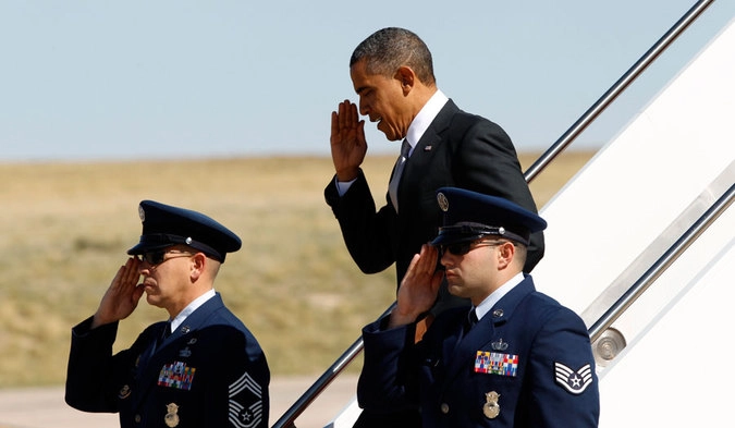 Барак Обама выходит из самолета в Денвере, где скоро начнутся дебаты кандидатов в президенты США. © Kevin Lamarque/Reuters
