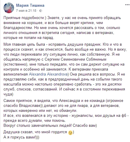 «Моя главная цель была — исправить дедушке праздник. Кто, что в процессе скажет и как отнесется, было вообще не важно. Но я вижу, что люди переживали эту ситуацию лично, как собственную. Я не общалась напрямую с Сергеем Семеновичем Собяниным (естественно), мне только передали, что он сам держит ситуацию на контроле и особенно ей занимается. К ветеранам приехала великолепная Александра Александрова (глава комитета общественных связей Москвы. — Прим. „Ридуса“). Она решила все вопросы», — написала блогер.