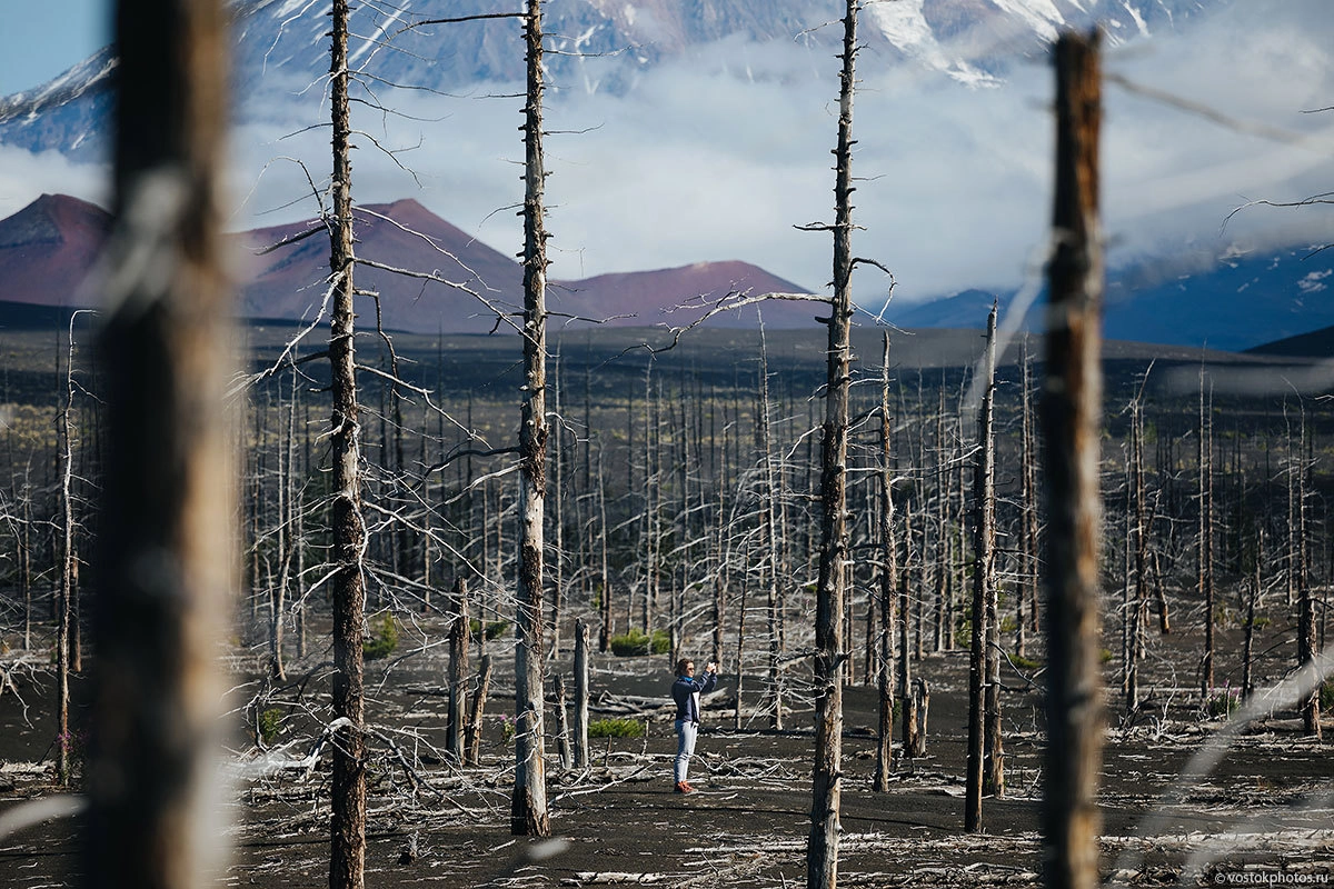 12. Ближайшие хвойные леса основательно завалило пеплом. Мертвый лес — место жуткое со своей зловещей атмосферой и одновременно очень красивое. Не сразу становится понятно, что видно лишь верхушки деревьев. Слой пепла в этих местах достигает нескольких метров. При ходьбе нужно внимательно смотреть под ноги, так как под слоем пепла возможно появление пустот, которые образуются при вымывании шлака из неравномерных лавовых потоков.