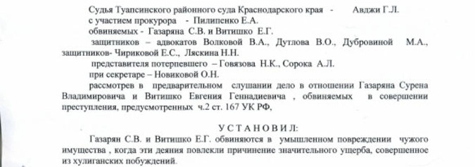 Это стало окончательно ясно сегодня, когда туапсинский райсуд отказал нам во всех существенных ходатайствах. Из 15 заявленных адвокатами ходатайств судья Галина Авджи удовлетворила только два: об исключении протокола моего опознания лжесвидетелем и о вызове в качестве свидетелей эксперта Астапенкова, насчитавшего 120 тысяч рублей в качестве ущерба от надписей "Саня-вор", и главного бухгалтера ООО "Капитель-2" Ошуркова. Который снова придет и скажет, что ущерб для "Капители" является значительным. Ведь никаких документов, указывающих на тяжелое материальное положение ООО "Капитель-2", впрочем, как и документов, подверждающих право собственности на забор и законность его возведения судья получить не пожелала.