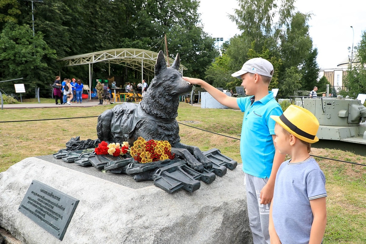 — Памятник «Фронтовой собаке» — один из первых, установленных Российским военно-историческим обществом. На фронтах Великой Отечественной войны было более 60 тысяч собак.