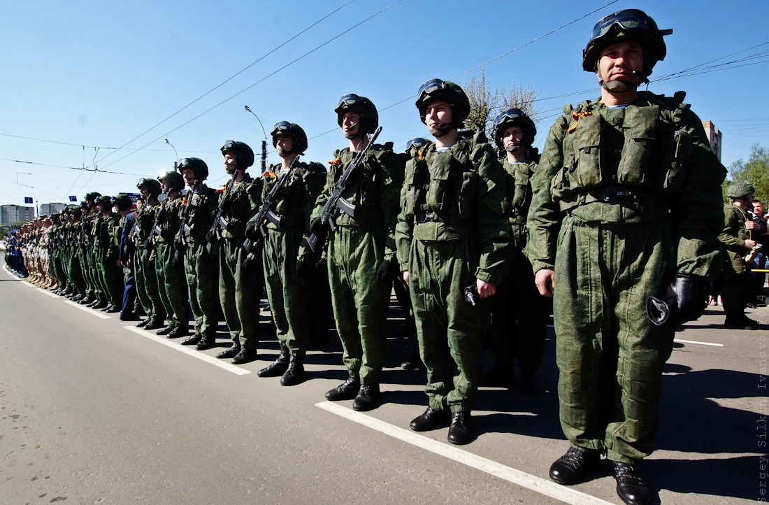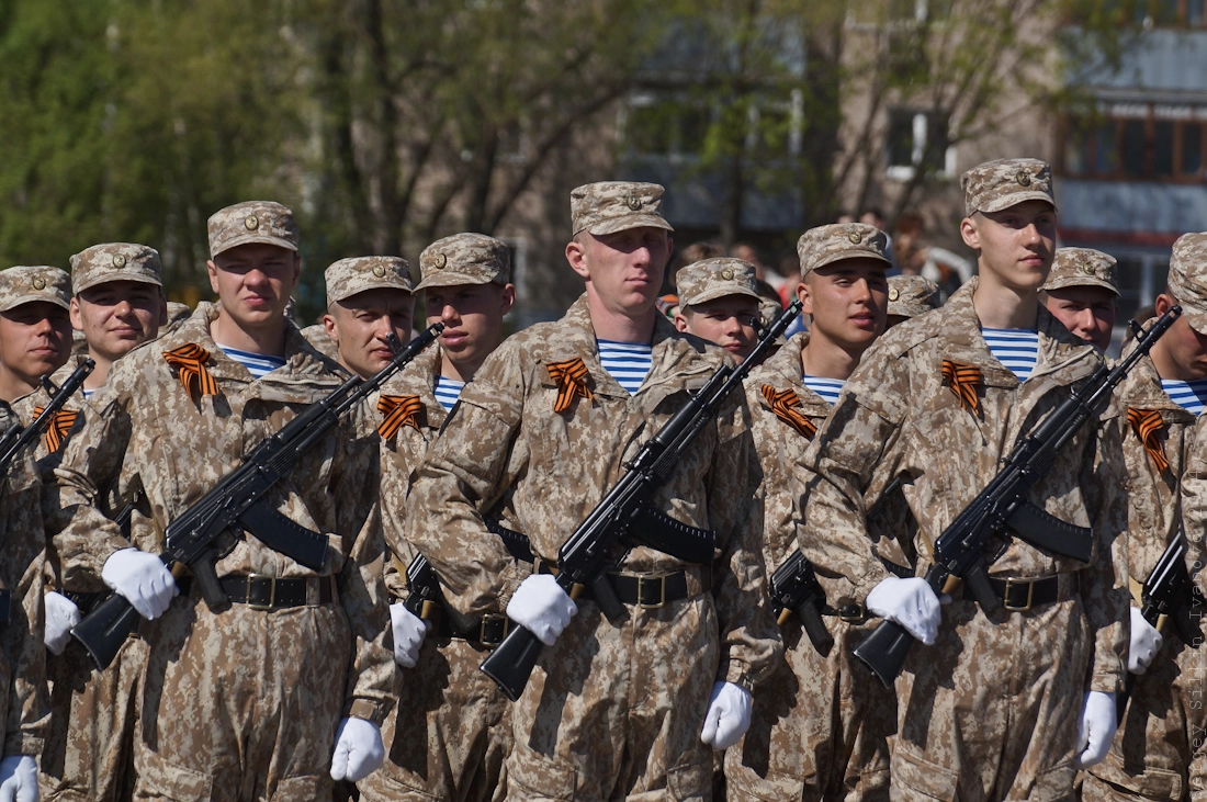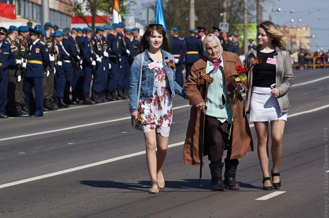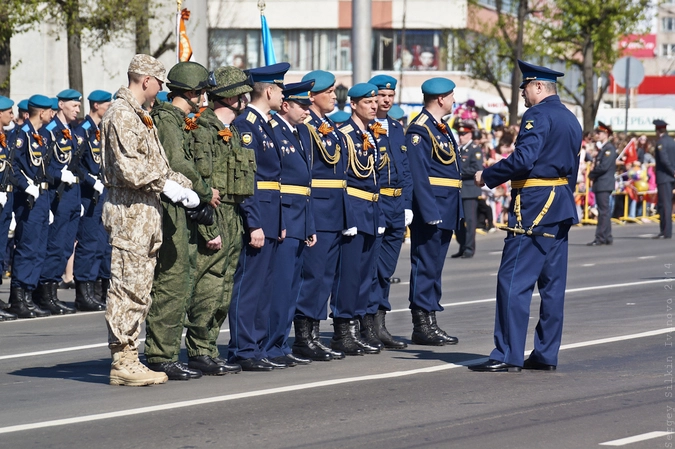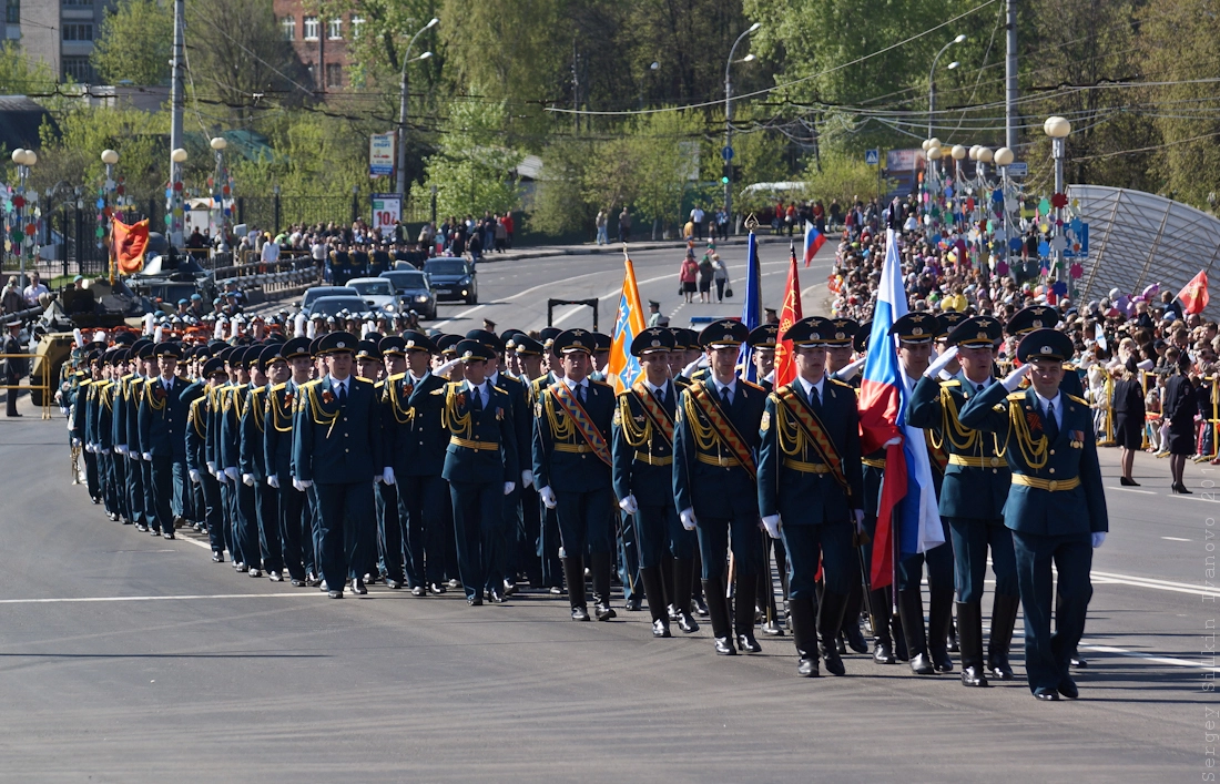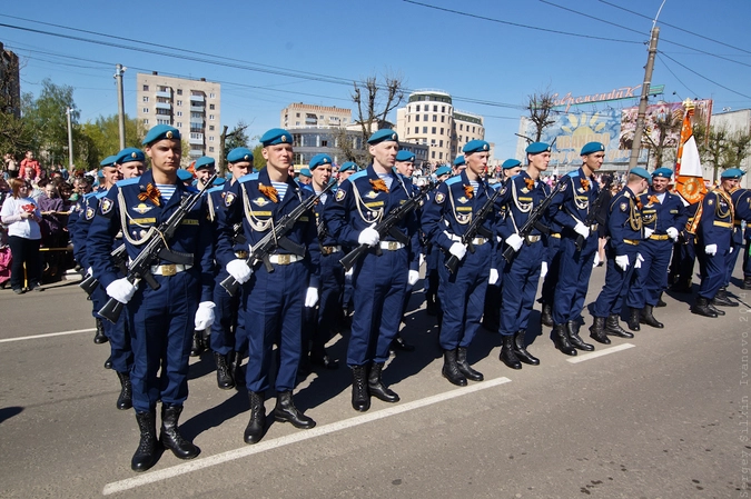 Затем прошел парад войск Ивановского гарнизона. В парадном строю прошли воины-десантники 98 дивизии ВДВ, летчики военного аэродрома Северный и курсанты института МЧС.