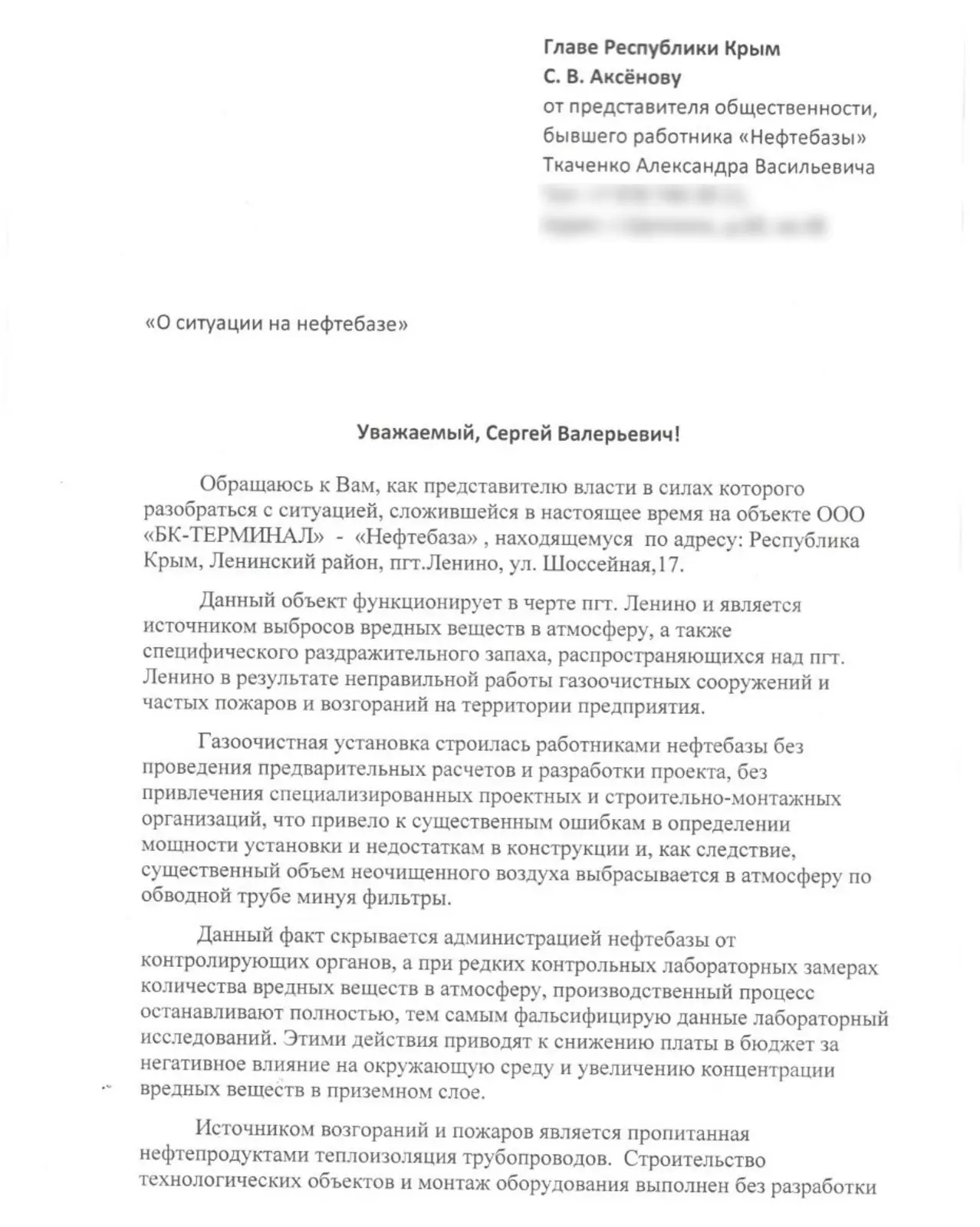 Недавно уволившийся работник нефтебазы Александр Ткаченко обратился к главе региона Аксёнову и рассказал о наличии обводной трубы в системе газоочистки, через которую существенный объём загрязнённого воздуха выбрасывается в атмосферу, минуя фильтры очистных сооружений.